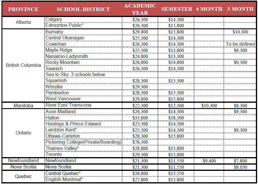 Dưới đây là danh sách các trường THPT tại các quận Alberta, British Columbia, Manitoba, Ontario, Newfoundland, Nova Scotia, Quebec :