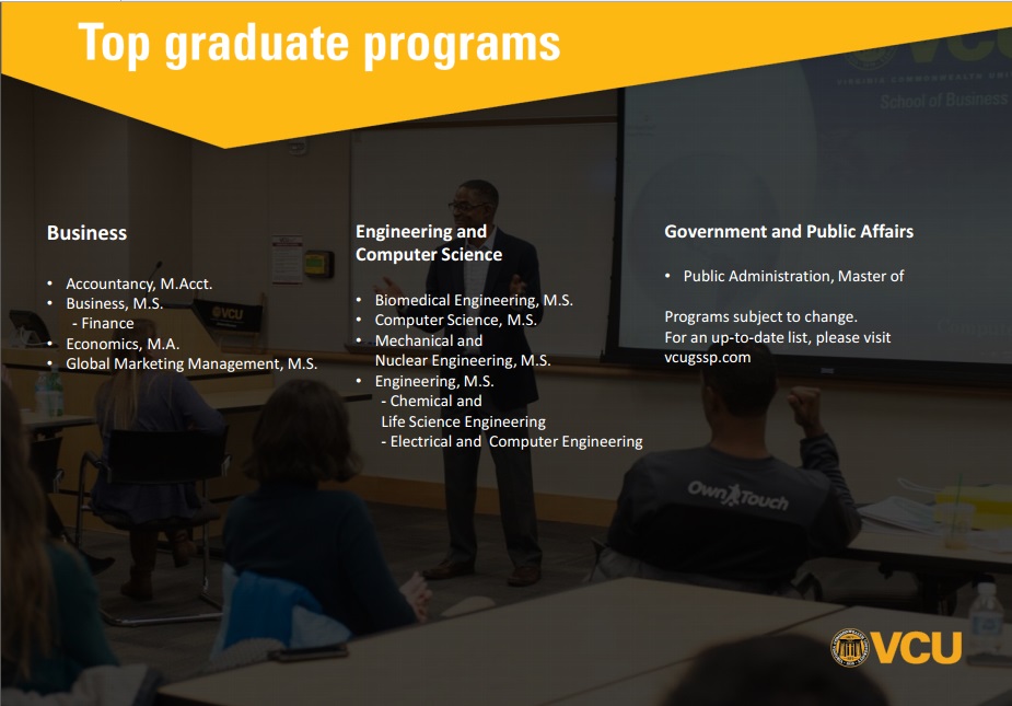 - VCU là nơi đặt trung tâm y khoa, các trường nghệ thuật hàng đầu cùng nhiều chương trình sau cử nhân có thứ hạng cao trên cả nước.